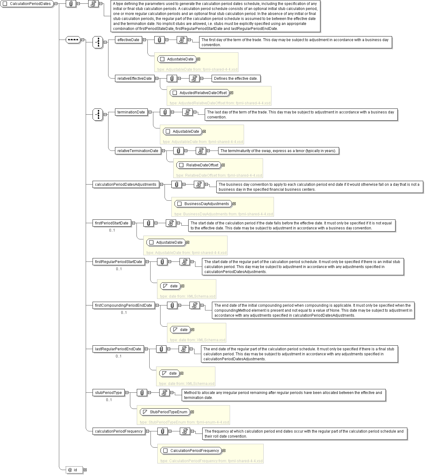 | Documentation | A type defining the parameters used to generate the calculation period dates schedule, including the specification of any initial or final stub calculation periods. A calculation perod schedule consists of an optional initial stub calculation period, one or more regular calculation periods and an optional final stub calculation period. In the absence of any initial or final stub calculation periods, the regular part of the calculation period schedule is assumed to be between the effective date and the termination date. No implicit stubs are allowed, i.e. stubs must be explicitly specified using an appropriate combination of firstPeriodStateDate, firstRegularPeriodStartDate and lastRegularPeriodEndDate. |