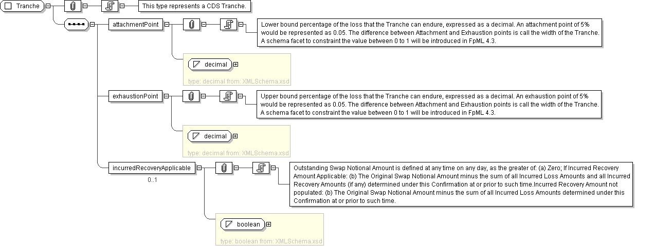 'Lower bound percentage of the loss that the Tranche can endure, expressed as a decimal. An attachment point of 5% would be represented as 0.05. The difference between Attachment and Exhaustion points is call the width of the Tranche. A schema facet to constraint the value between 0 to 1 will be introduced in FpML 4.3.'
