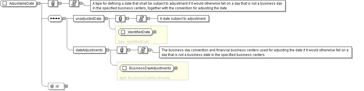| Documentation | A type for defining a date that shall be subject to adjustment if it would otherwise fall on a day that is not a business day in the specified business centers, together with the convention for adjusting the date. |