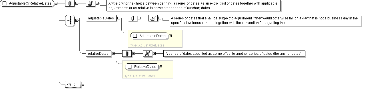 | Documentation | A type giving the choice between defining a series of dates as an explicit list of dates together with applicable adjustments or as relative to some other series of (anchor) dates. |