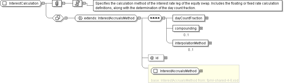 | Documentation | Specifies the calculation method of the interest rate leg of the equity swap. Includes the floating or fixed rate calculation definitions, along with the determination of the day count fraction. |