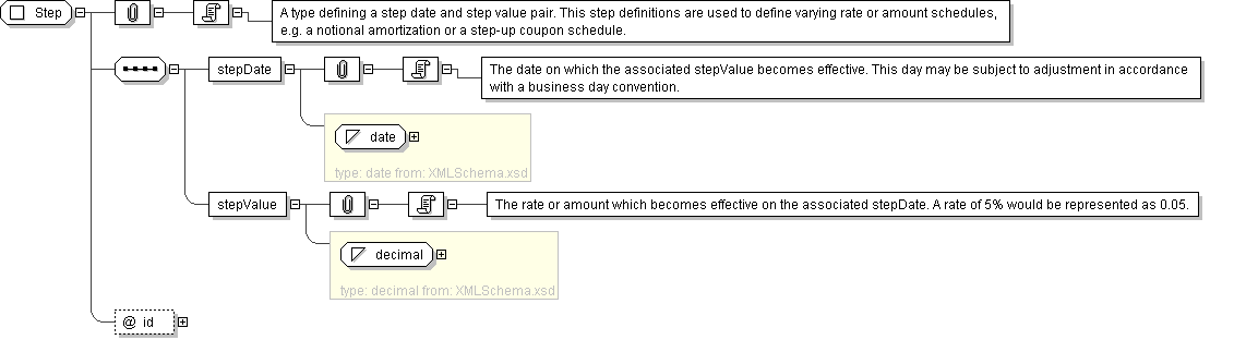 | Documentation | A type defining a step date and step value pair. This step definitions are used to define varying rate or amount schedules, e.g. a notional amortization or a step-up coupon schedule. |
