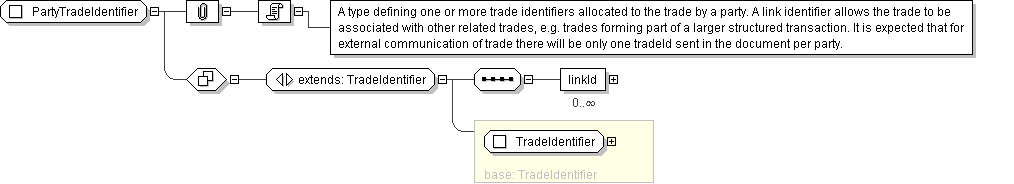 | Documentation | A type defining one or more trade identifiers allocated to the trade by a party. A link identifier allows the trade to be associated with other related trades, e.g. trades forming part of a larger structured transaction. It is expected that for external communication of trade there will be only one tradeId sent in the document per party. |