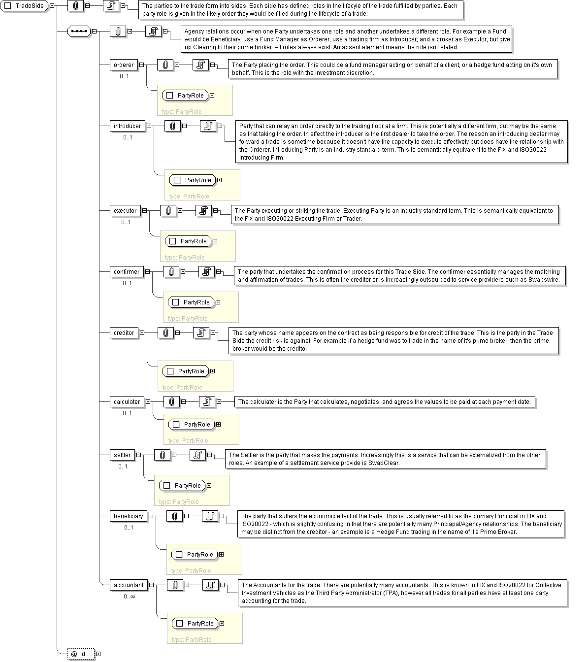 | Documentation | The parties to the trade form into sides. Each side has defined roles in the lifecyle of the trade fulfilled by parties. Each party role is given in the likely order they would be filled during the lifecycle of a trade. |