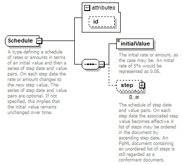 A type defining a schedule of rates or amounts in terms of an initial value and then a series of step date and value pairs. On each step date the rate or amount changes to the new step value. The series of step date and value pairs are optional. If not specified, this implies that the initial value remains unchanged over time.