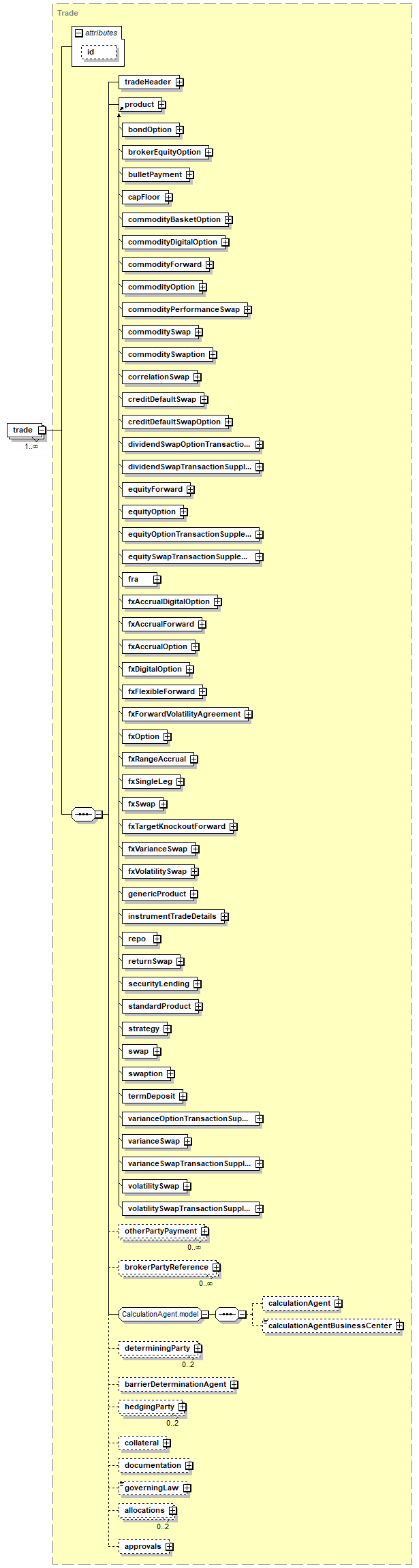 bondOption, brokerEquityOption, bulletPayment, capFloor, commodityBasketOption, commodityDigitalOption, commodityForward, commodityOption, commodityPerformanceSwap, commoditySwap, commoditySwaption, correlationSwap, creditDefaultSwap, creditDefaultSwapOption, dividendSwapOptionTransactionSupplement, dividendSwapTransactionSupplement, equityForward, equityOption, equityOptionTransactionSupplement, equitySwapTransactionSupplement, fra, fxAccrualDigitalOption, fxAccrualForward, fxAccrualOption, fxDigitalOption, fxFlexibleForward, fxForwardVolatilityAgreement, fxOption, fxRangeAccrual, fxSingleLeg, fxSwap, fxTargetKnockoutForward, fxVarianceSwap, fxVolatilitySwap, genericProduct, instrumentTradeDetails, repo, returnSwap, securityLending, standardProduct, strategy, swap, swaption, termDeposit, varianceOptionTransactionSupplement, varianceSwap, varianceSwapTransactionSupplement, volatilitySwap, volatilitySwapTransactionSupplement