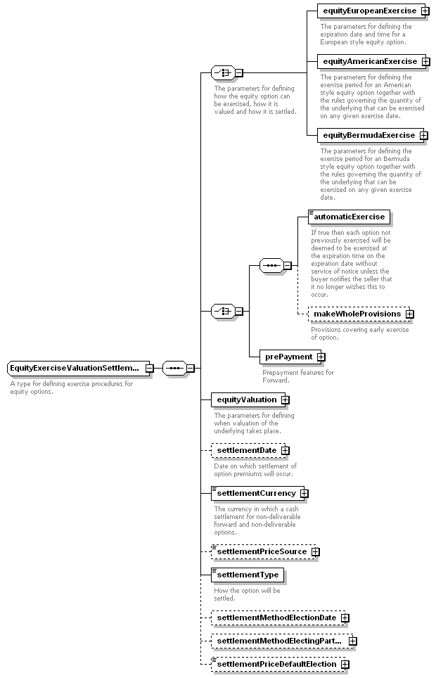 | <xsd:complexType name="EquityExerciseValuationSettlement"> <xsd:sequence> <xsd:choice> </xsd:choice> <xsd:choice> <xsd:sequence> </xsd:sequence> </xsd:choice> <xsd:element minOccurs="0" name="settlementPriceDefaultElection" type="SettlementPriceDefaultElection"/> </xsd:sequence> </xsd:complexType> |