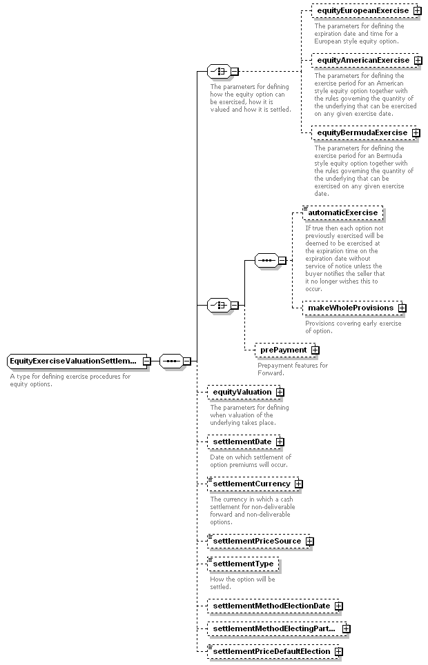 | <xsd:complexType name="EquityExerciseValuationSettlement"> <xsd:sequence> <xsd:choice> </xsd:choice> <xsd:choice> <xsd:sequence> </xsd:sequence> </xsd:choice> <xsd:element minOccurs="0" name="settlementPriceDefaultElection" type="SettlementPriceDefaultElection"/> </xsd:sequence> </xsd:complexType> |