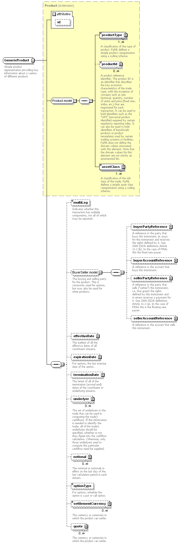 <xsd:complexType name="GenericProduct"> <xsd:complexContent> <xsd:sequence> <!-- BAL 2011-10-06 restored option type for consistency with 5.2 --> <!-- LL 9/14/11 commented out pending WG/SC decision on how to proceed with generic properties, reverted to original definitions from 5.2TR <xsd:element name="exerciseStyle" type="GenericExerciseStyle" minOccurs="0"> <xsd:annotation> <xsd:documentation xml:lang="en">For options, whether the option is a put or call option.</xsd:documentation> </xsd:annotation> </xsd:element> --> <xsd:element maxOccurs="unbounded" minOccurs="0" name="settlementCurrency" type="IdentifiedCurrency"/> <!-- <xsd:group ref="GenericProductProperty.model" minOccurs="0" maxOccurs="unbounded" /> --> </xsd:sequence> </xsd:extension> </xsd:complexContent> </xsd:complexType> |