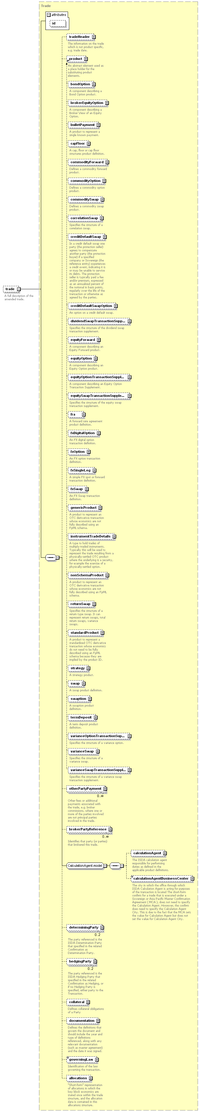 tradeHeader?, product?, otherPartyPayment*, brokerPartyReference*, calculationAgent?, calculationAgentBusinessCenter?, determiningParty[0..2], hedgingParty[0..2], collateral?, documentation?, governingLaw?, allocations?