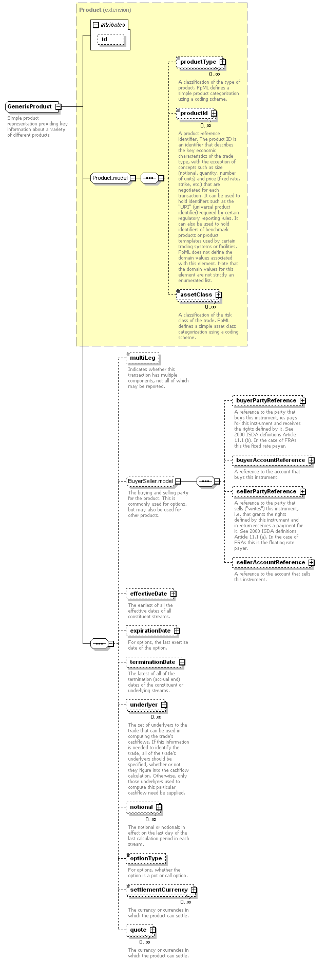 | <xsd:complexType name="GenericProduct"> <xsd:complexContent> <xsd:sequence> <!-- BAL 2011-10-06 restored option type for consistency with 5.2 --> <!-- LL 9/14/11 commented out pending WG/SC decision on how to proceed with generic properties, reverted to original definitions from 5.2TR <xsd:element name="exerciseStyle" type="GenericExerciseStyle" minOccurs="0"> <xsd:annotation> <xsd:documentation xml:lang="en">For options, whether the option is a put or call option.</xsd:documentation> </xsd:annotation> </xsd:element> --> <xsd:element maxOccurs="unbounded" minOccurs="0" name="settlementCurrency" type="IdentifiedCurrency"/> <!-- <xsd:group ref="GenericProductProperty.model" minOccurs="0" maxOccurs="unbounded" /> --> </xsd:sequence> </xsd:extension> </xsd:complexContent> </xsd:complexType> |