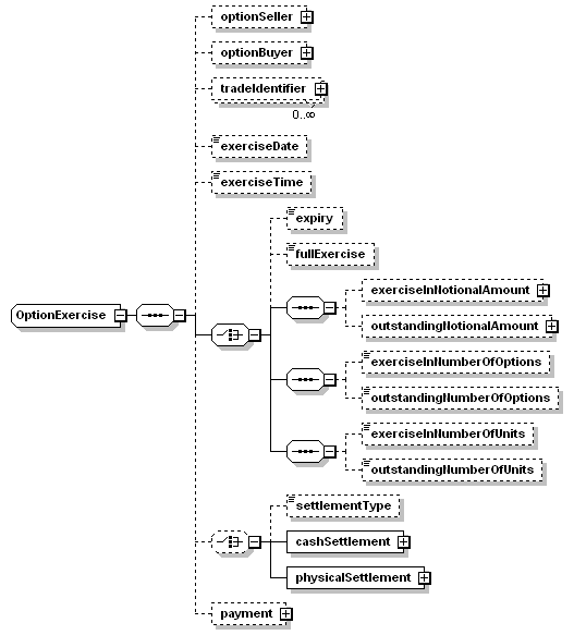 <xsd:complexType name="OptionExercise"> <xsd:sequence> <xsd:element maxOccurs="unbounded" minOccurs="0" name="tradeIdentifier" type="PartyTradeIdentifier"/> <xsd:choice> <xsd:sequence> </xsd:sequence> <xsd:sequence> </xsd:sequence> <xsd:sequence> </xsd:sequence> </xsd:choice> <xsd:choice minOccurs="0"> <!--plugged GEM/CICTO proposal here (InstrumentTrade) --> </xsd:element> </xsd:choice> </xsd:sequence> </xsd:complexType> |