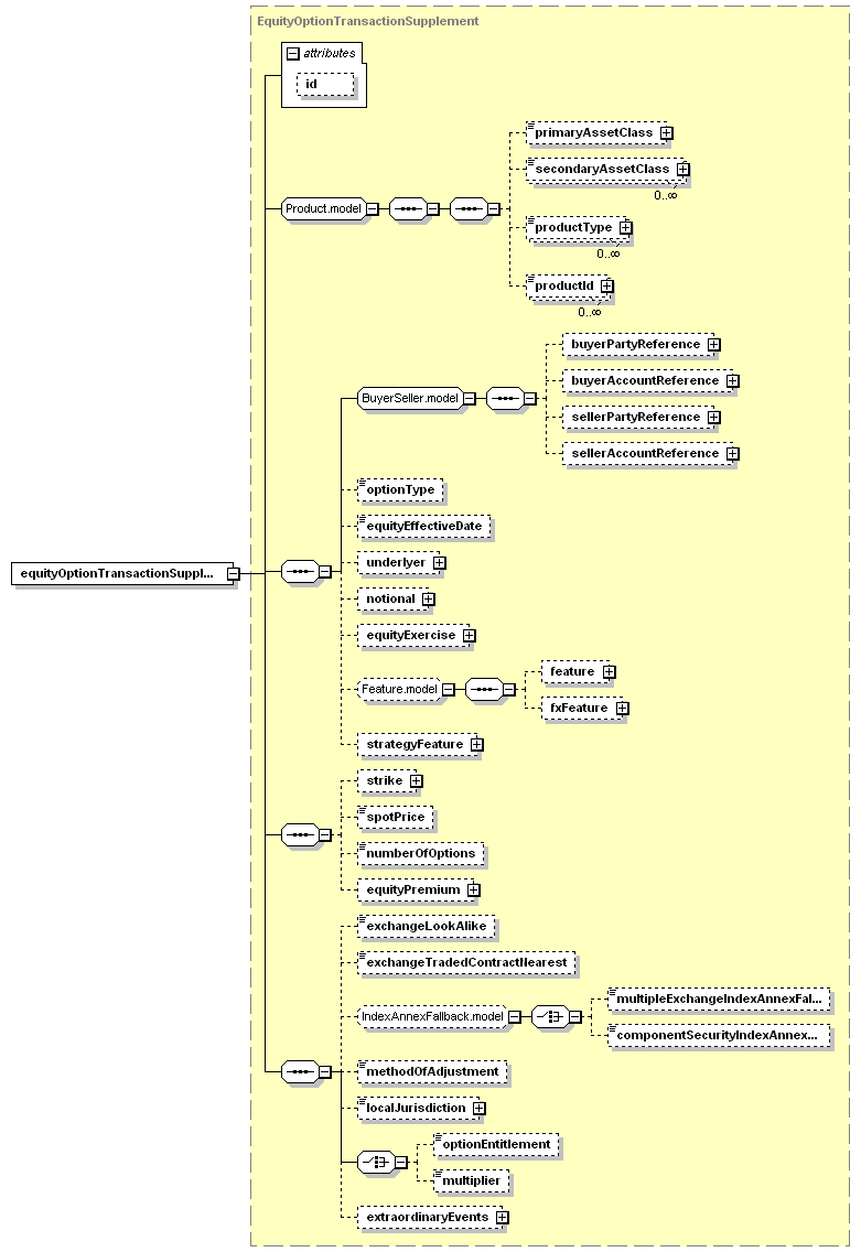 primaryAssetClass?, secondaryAssetClass*, productType*, productId*, buyerPartyReference?, buyerAccountReference?, sellerPartyReference?, sellerAccountReference?, optionType?, equityEffectiveDate?, underlyer?, notional?, equityExercise?, (feature?, fxFeature?)?, strategyFeature?, strike?, spotPrice?, numberOfOptions?, equityPremium?, exchangeLookAlike?, exchangeTradedContractNearest?, (multipleExchangeIndexAnnexFallback? | componentSecurityIndexAnnexFallback?)?, methodOfAdjustment?, localJurisdiction?, (optionEntitlement? | multiplier?), extraordinaryEvents?