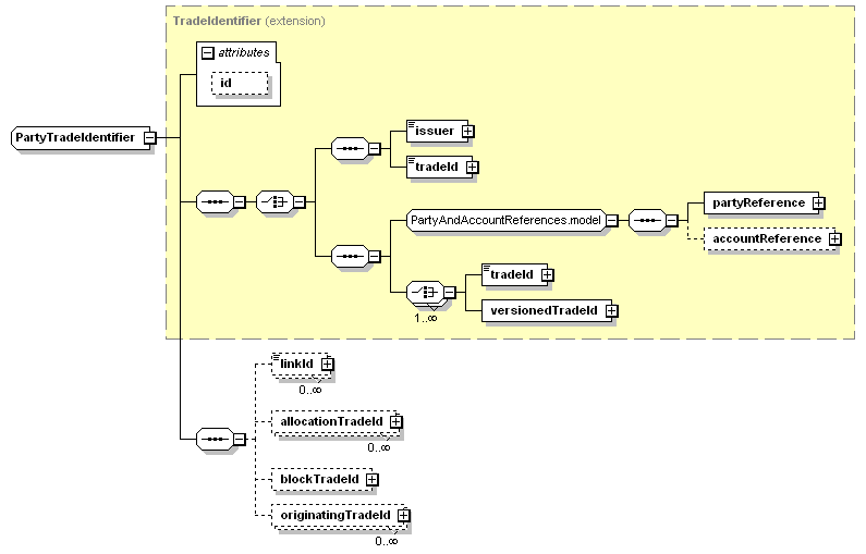 <xsd:complexType name="PartyTradeIdentifier"> <xsd:complexContent> <xsd:sequence> <xsd:element maxOccurs="unbounded" minOccurs="0" name="linkId" type="LinkId"/> </xsd:sequence> </xsd:extension> </xsd:complexContent> </xsd:complexType> |