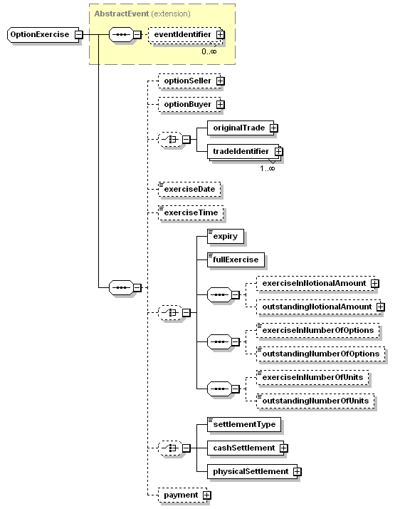 <xsd:complexType name="OptionExercise"> <xsd:complexContent> <xsd:sequence> <xsd:choice minOccurs="0"> </xsd:choice> <xsd:choice minOccurs="0"> <xsd:sequence> </xsd:sequence> <xsd:sequence> </xsd:sequence> <xsd:sequence> </xsd:sequence> </xsd:choice> <xsd:choice minOccurs="0"> <!--plugged GEM/CICTO proposal here (InstrumentTrade) --> </xsd:element> </xsd:choice> </xsd:sequence> </xsd:extension> </xsd:complexContent> </xsd:complexType> |