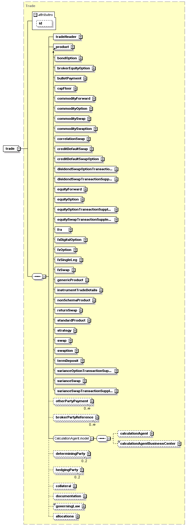 tradeHeader, product, otherPartyPayment*, brokerPartyReference*, calculationAgent?, calculationAgentBusinessCenter?, determiningParty[0..2], hedgingParty[0..2], collateral?, documentation?, governingLaw?, allocations?