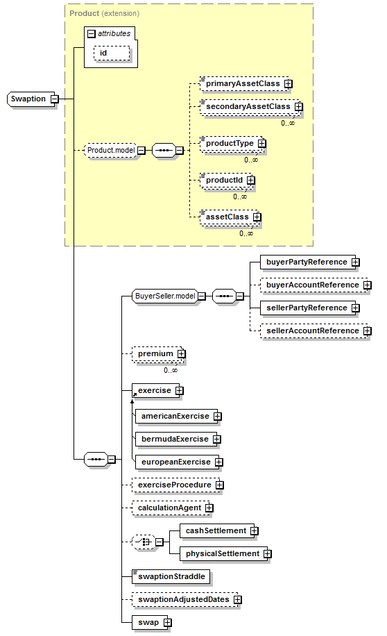 | <xsd:complexType name="Swaption"> <xsd:complexContent> <xsd:sequence> <xsd:choice minOccurs="0"> </xsd:choice> </xsd:sequence> </xsd:extension> </xsd:complexContent> </xsd:complexType> |