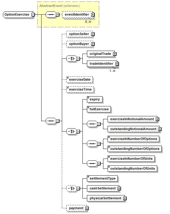 <xsd:complexType name="OptionExercise"> <xsd:complexContent> <xsd:sequence> <xsd:choice> </xsd:choice> <xsd:choice> <xsd:sequence> </xsd:sequence> <xsd:sequence> </xsd:sequence> <xsd:sequence> </xsd:sequence> </xsd:choice> <xsd:choice minOccurs="0"> </xsd:choice> </xsd:sequence> </xsd:extension> </xsd:complexContent> </xsd:complexType> |