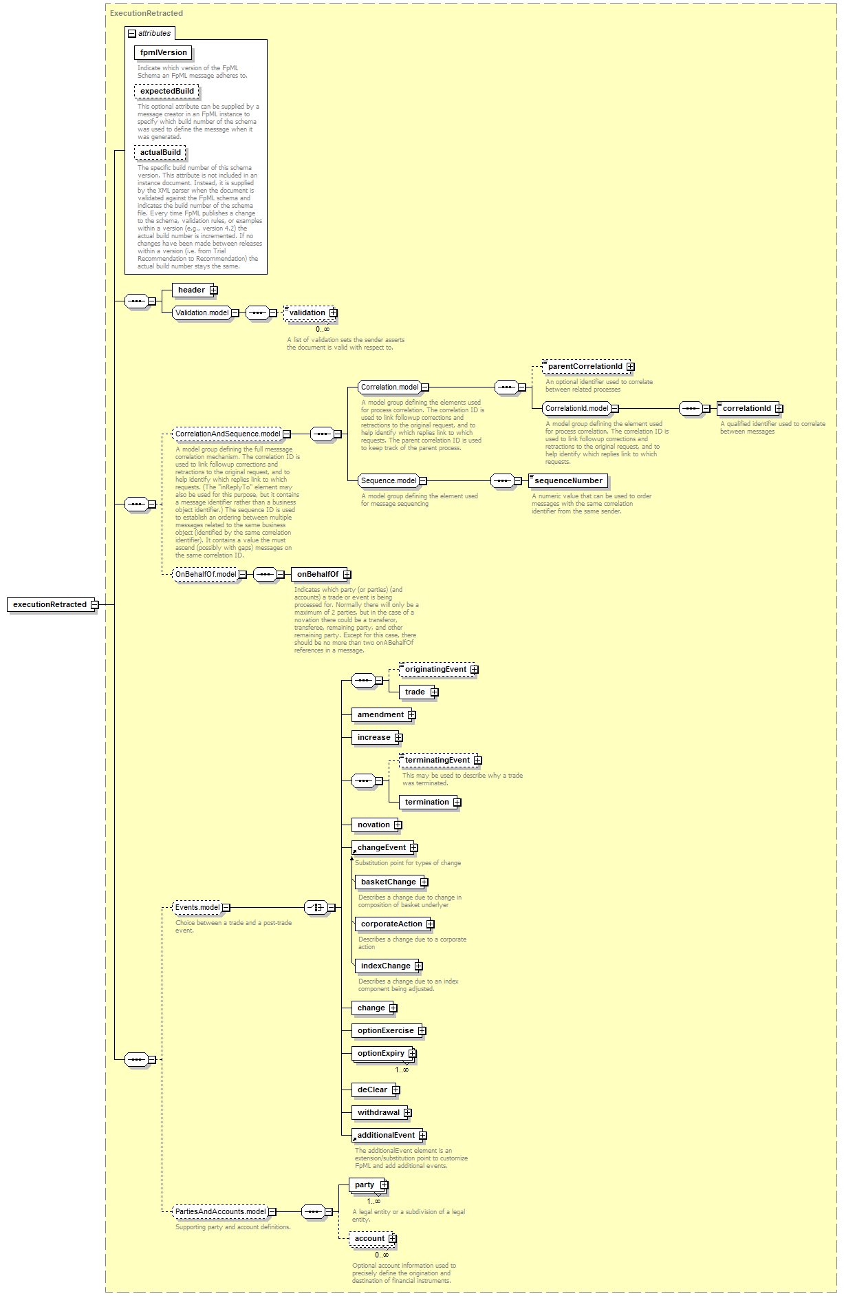 header, validation*, (parentCorrelationId?, correlationId, sequenceNumber)?, onBehalfOf?, ((originatingEvent?, trade) | amendment | increase | (terminatingEvent?, termination) | novation | changeEvent | change | optionExercise | optionExpiry+ | deClear | withdrawal | additionalEvent)?, (party+, account*)?