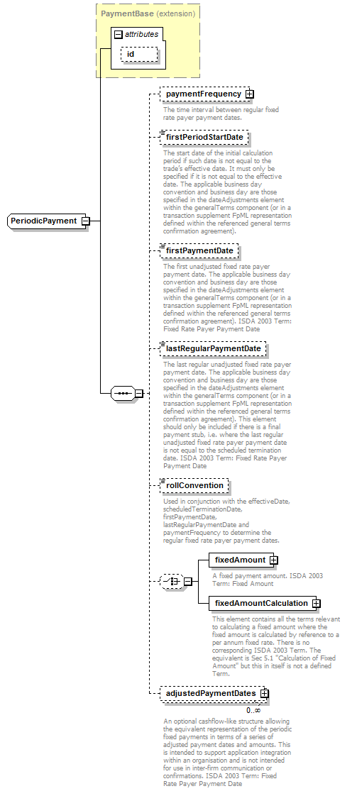 | <xsd:complexType name="PeriodicPayment"> <xsd:complexContent> <xsd:sequence> <xsd:choice minOccurs="0"> </xsd:choice> <xsd:element maxOccurs="unbounded" minOccurs="0" name="adjustedPaymentDates" type="AdjustedPaymentDates"/> </xsd:sequence> </xsd:extension> </xsd:complexContent> </xsd:complexType> |