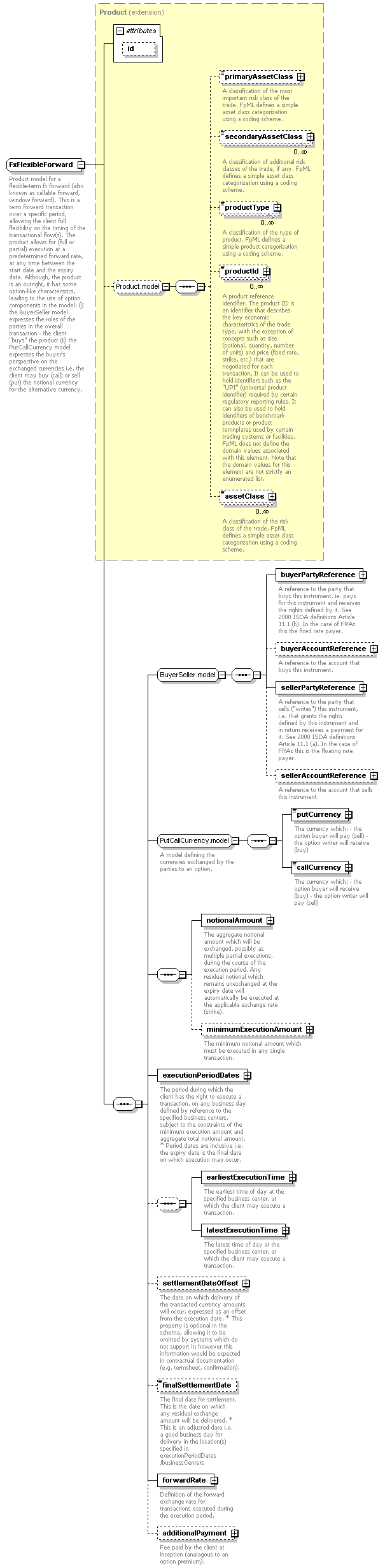 Product model for a flexible-term fx forward (also known as callable forward, window forward). This is a term forward transaction over a specific period, allowing the client full flexibility on the timing of the transactional flow(s). The product allows for (full or partial) execution at a predetermined forward rate, at any time between the start date and the expiry date. Although, the product is an outright, it has some option-like characteristics, leading to the use of option components in the model: (i) the BuyerSeller model expresses the roles of the parties in the overall transaction - the client "buys" the product (ii) the PutCallCurrency model expresses the buyer's perspective on the exchanged currencies i.e. the client may buy (call) or sell (put) the notional currency for the alternative currency.