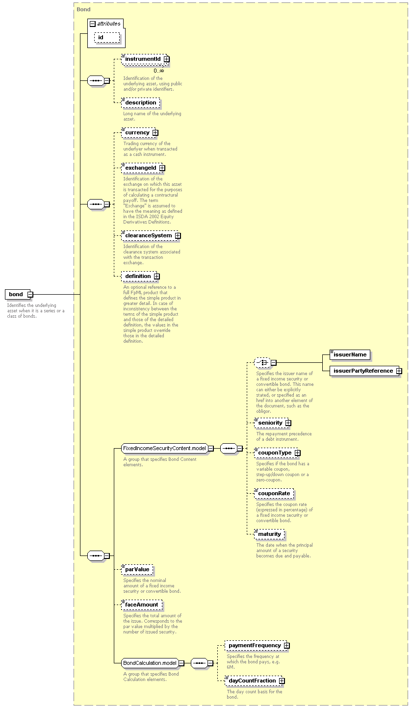 instrumentId*, description?, currency?, exchangeId?, clearanceSystem?, definition?, (issuerName | issuerPartyReference)?, seniority?, couponType?, couponRate?, maturity?, parValue?, faceAmount?, paymentFrequency?, dayCountFraction?