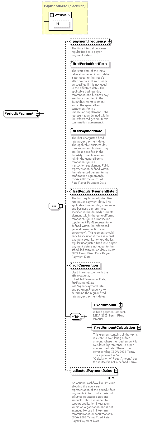 <xsd:complexType name="PeriodicPayment"> <xsd:complexContent> <xsd:sequence> <xsd:choice> </xsd:choice> <xsd:element maxOccurs="unbounded" minOccurs="0" name="adjustedPaymentDates" type="AdjustedPaymentDates"/> </xsd:sequence> </xsd:extension> </xsd:complexContent> </xsd:complexType> |