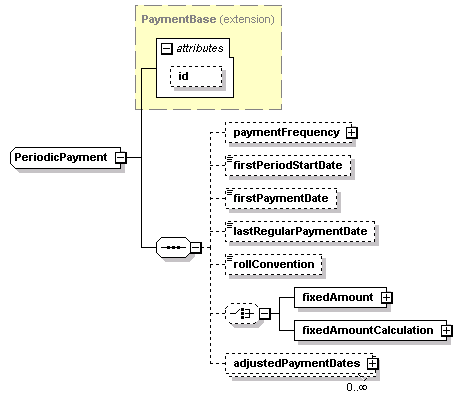 | <xsd:complexType name="PeriodicPayment"> <xsd:complexContent> <xsd:sequence> <xsd:choice minOccurs="0"> </xsd:choice> <xsd:element maxOccurs="unbounded" minOccurs="0" name="adjustedPaymentDates" type="AdjustedPaymentDates"/> </xsd:sequence> </xsd:extension> </xsd:complexContent> </xsd:complexType> |