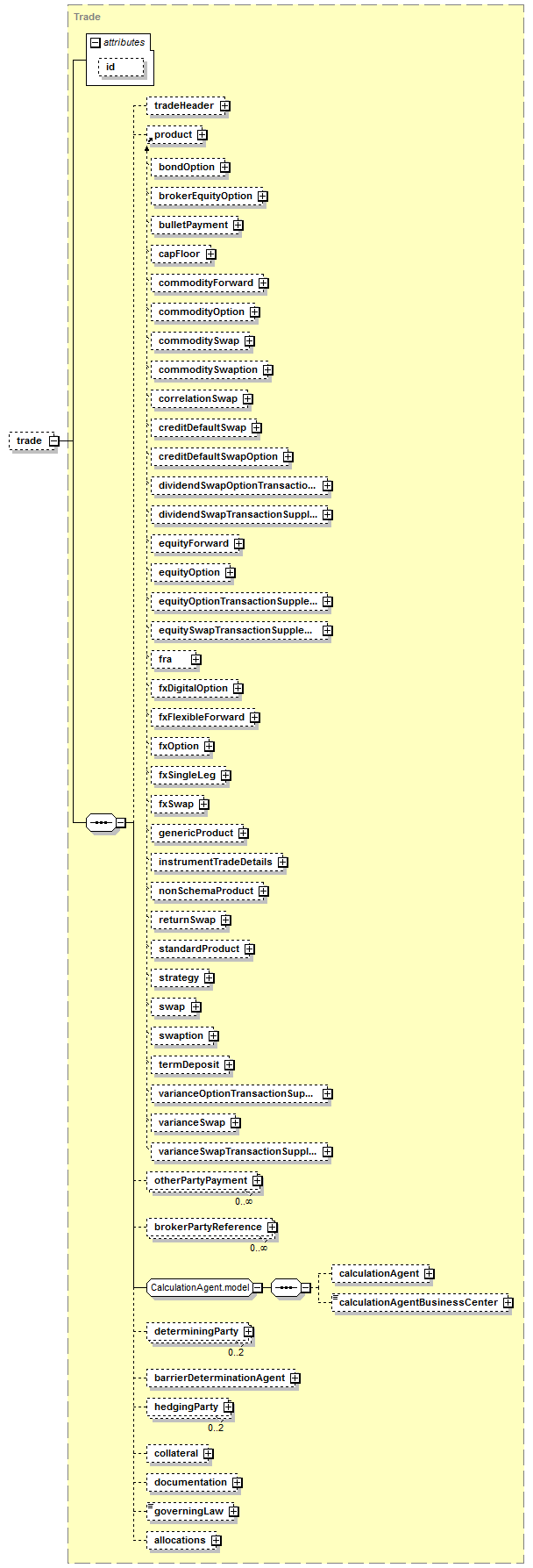tradeHeader?, product?, otherPartyPayment*, brokerPartyReference*, calculationAgent?, calculationAgentBusinessCenter?, determiningParty[0..2], barrierDeterminationAgent?, hedgingParty[0..2], collateral?, documentation?, governingLaw?, allocations?