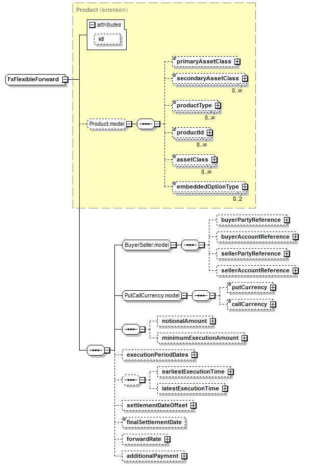 (primaryAssetClass?, secondaryAssetClass*, productType*, productId*, assetClass*, embeddedOptionType[0..2])?, buyerPartyReference?, buyerAccountReference?, sellerPartyReference?, sellerAccountReference?, putCurrency?, callCurrency?, notionalAmount?, minimumExecutionAmount?, executionPeriodDates?, (earliestExecutionTime?, latestExecutionTime?)?, settlementDateOffset?, finalSettlementDate?, forwardRate?, additionalPayment? |