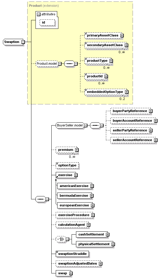 <xsd:complexType name="Swaption"> <xsd:complexContent> <xsd:sequence> <xsd:choice minOccurs="0"> </xsd:choice> </xsd:sequence> </xsd:extension> </xsd:complexContent> </xsd:complexType> |