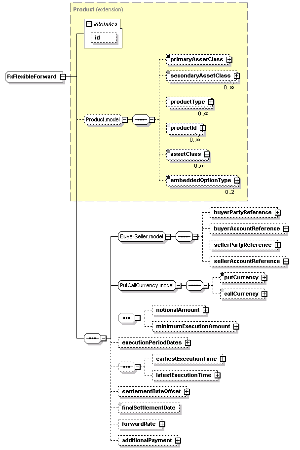 (primaryAssetClass?, secondaryAssetClass*, productType*, productId*, assetClass*, embeddedOptionType[0..2])?, buyerPartyReference?, buyerAccountReference?, sellerPartyReference?, sellerAccountReference?, putCurrency?, callCurrency?, notionalAmount?, minimumExecutionAmount?, executionPeriodDates?, (earliestExecutionTime?, latestExecutionTime?)?, settlementDateOffset?, finalSettlementDate?, forwardRate?, additionalPayment? |