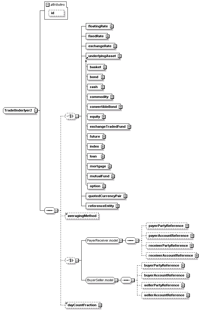 <xsd:complexType name="TradeUnderlyer2"> <xsd:sequence> <xsd:choice minOccurs="0"> </xsd:choice> <xsd:choice minOccurs="0"> </xsd:choice> </xsd:sequence> <xsd:attribute name="id" type="xsd:ID"/> </xsd:complexType> |