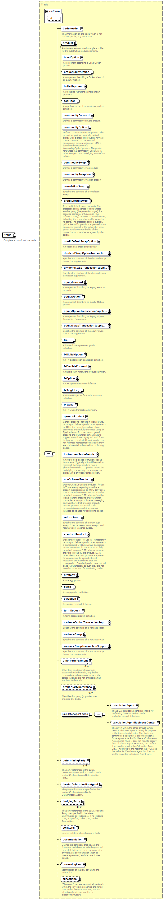 tradeHeader, product, otherPartyPayment*, brokerPartyReference*, calculationAgent?, calculationAgentBusinessCenter?, determiningParty[0..2], barrierDeterminationAgent?, hedgingParty[0..2], collateral?, documentation?, governingLaw?, allocations?