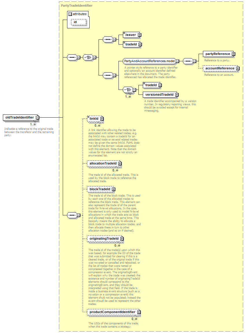 ((issuer, tradeId) | (partyReference, accountReference?, (tradeId | versionedTradeId)+)), linkId*, allocationTradeId*, blockTradeId?, originatingTradeId*, productComponentIdentifier*