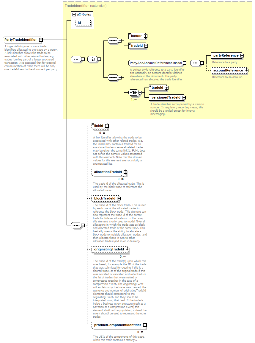 | <xsd:complexType name="PartyTradeIdentifier"> <xsd:complexContent> <xsd:sequence> <xsd:element maxOccurs="unbounded" minOccurs="0" name="linkId" type="LinkId"/> </xsd:sequence> </xsd:extension> </xsd:complexContent> </xsd:complexType> |