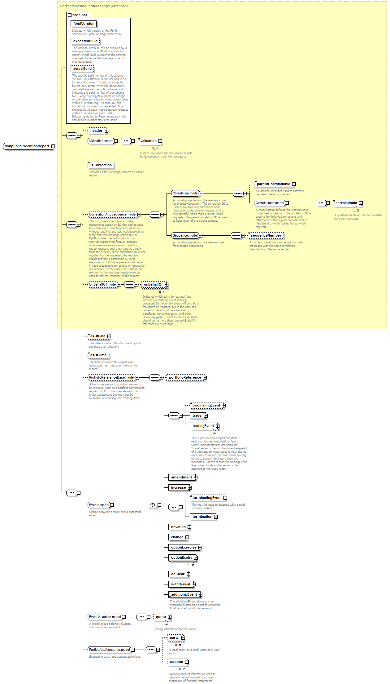 | <xsd:complexType name="NonpublicExecutionReport"> <xsd:complexContent> <xsd:sequence> <!-- BAL - added 2011-10-18 to address gaps with DTCC requirements --> <!-- Removed 2012-02-12 per rptwg 2012-02-13, moved to reportingRegime <xsd:element name="reportingPurpose" type="ReportingPurpose" minOccurs="0" maxOccurs="unbounded"> <xsd:annotation> <xsd:documentation xml:lang="en">The reason this message is being sent, for example Snapshot, PET, Confirmation, RealTimePublic.</xsd:documentation> </xsd:annotation> </xsd:element> --> <!-- BAL - end 2011-10-18 additions to address gaps with DTCC requirements --> </xsd:sequence> </xsd:extension> </xsd:complexContent> </xsd:complexType> |