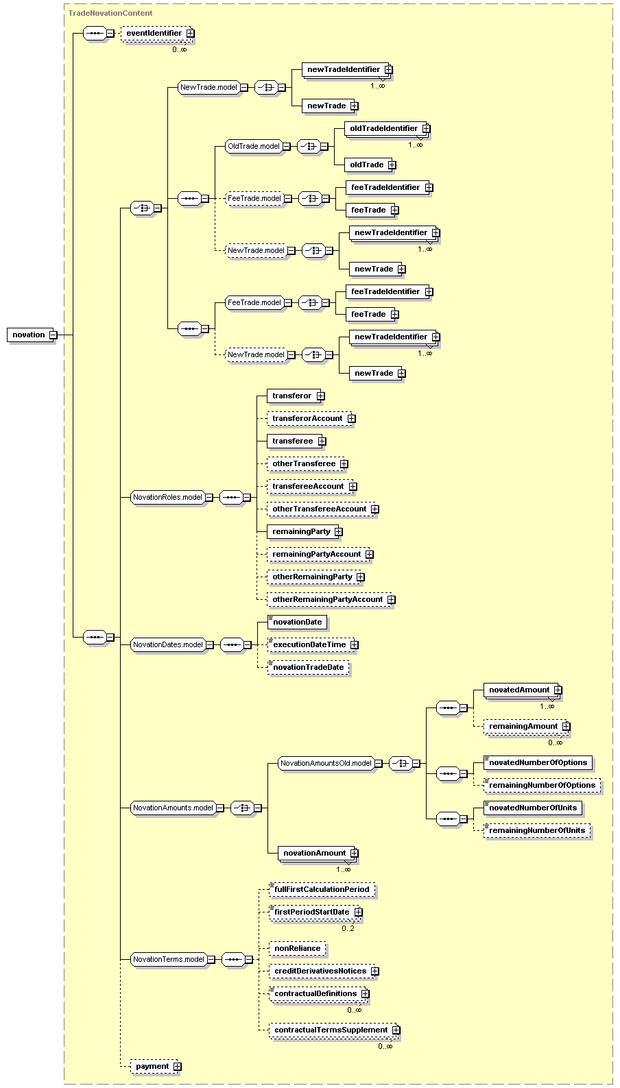 eventIdentifier*, (newTradeIdentifier+ | newTrade | ((oldTradeIdentifier+ | oldTrade), (feeTradeIdentifier | feeTrade)?, (newTradeIdentifier+ | newTrade)?) | ((feeTradeIdentifier | feeTrade), (newTradeIdentifier+ | newTrade)?)), transferor, transferorAccount?, transferee, otherTransferee?, transfereeAccount?, otherTransfereeAccount?, remainingParty, remainingPartyAccount?, otherRemainingParty?, otherRemainingPartyAccount?, novationDate, executionDateTime?, novationTradeDate?, ((novatedAmount+, remainingAmount*) | (novatedNumberOfOptions, remainingNumberOfOptions?) | (novatedNumberOfUnits, remainingNumberOfUnits?) | novationAmount+), fullFirstCalculationPeriod?, firstPeriodStartDate[0..2], nonReliance?, creditDerivativesNotices?, contractualDefinitions*, contractualTermsSupplement*, payment? |