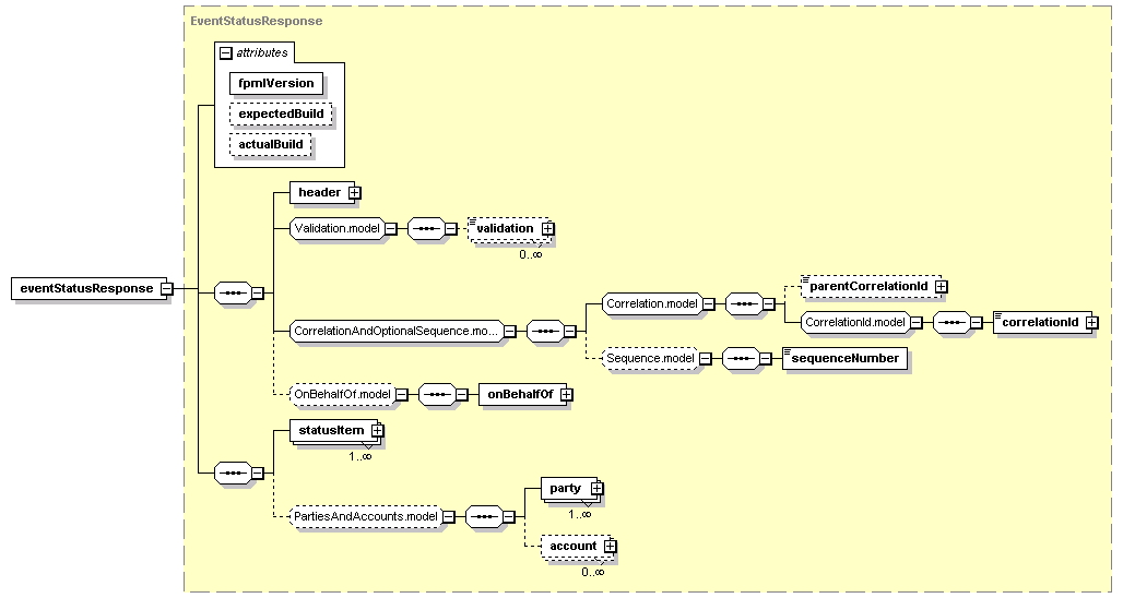 header, validation*, parentCorrelationId?, correlationId, sequenceNumber?, onBehalfOf?, statusItem+, (party+, account*)?