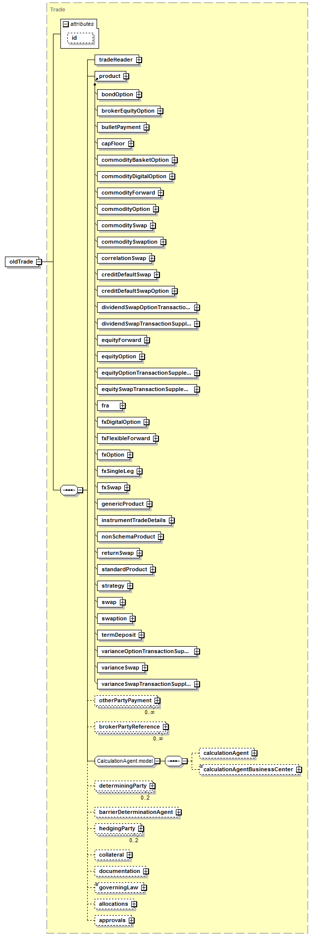 bondOption, brokerEquityOption, bulletPayment, capFloor, commodityBasketOption, commodityDigitalOption, commodityForward, commodityOption, commoditySwap, commoditySwaption, correlationSwap, creditDefaultSwap, creditDefaultSwapOption, dividendSwapOptionTransactionSupplement, dividendSwapTransactionSupplement, equityForward, equityOption, equityOptionTransactionSupplement, equitySwapTransactionSupplement, fra, fxDigitalOption, fxFlexibleForward, fxOption, fxSingleLeg, fxSwap, genericProduct, instrumentTradeDetails, nonSchemaProduct, returnSwap, standardProduct, strategy, swap, swaption, termDeposit, varianceOptionTransactionSupplement, varianceSwap, varianceSwapTransactionSupplement