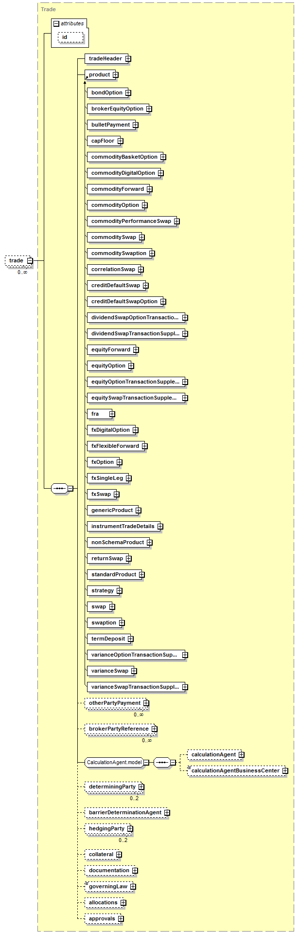 bondOption, brokerEquityOption, bulletPayment, capFloor, commodityBasketOption, commodityDigitalOption, commodityForward, commodityOption, commodityPerformanceSwap, commoditySwap, commoditySwaption, correlationSwap, creditDefaultSwap, creditDefaultSwapOption, dividendSwapOptionTransactionSupplement, dividendSwapTransactionSupplement, equityForward, equityOption, equityOptionTransactionSupplement, equitySwapTransactionSupplement, fra, fxDigitalOption, fxFlexibleForward, fxOption, fxSingleLeg, fxSwap, genericProduct, instrumentTradeDetails, nonSchemaProduct, returnSwap, standardProduct, strategy, swap, swaption, termDeposit, varianceOptionTransactionSupplement, varianceSwap, varianceSwapTransactionSupplement