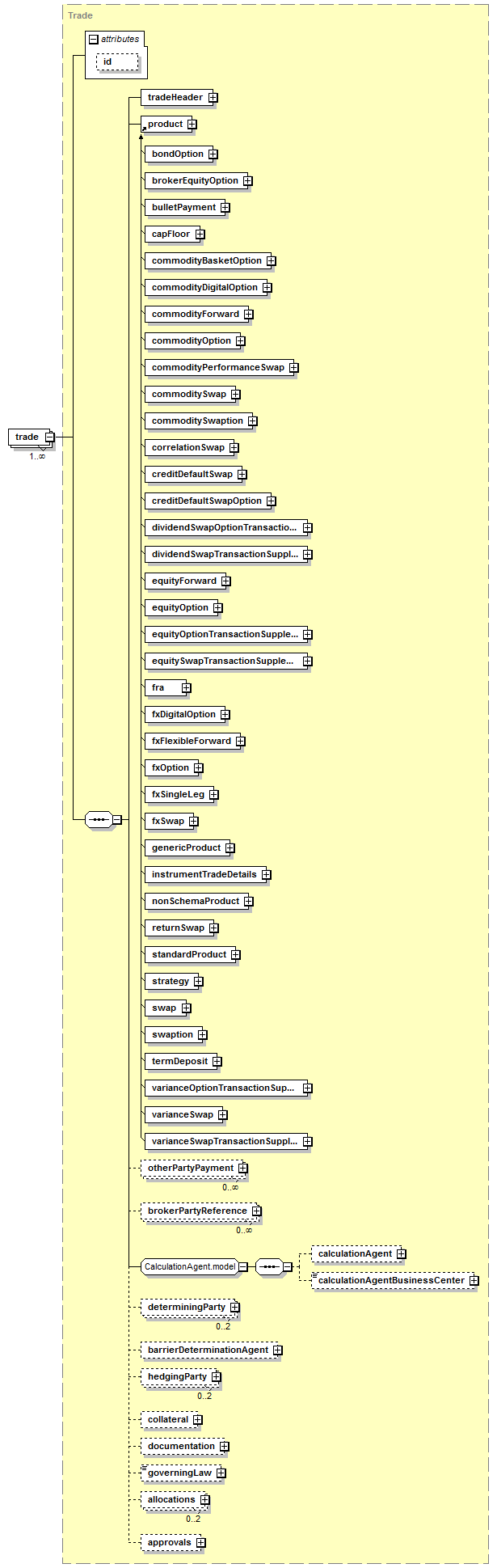 bondOption, brokerEquityOption, bulletPayment, capFloor, commodityBasketOption, commodityDigitalOption, commodityForward, commodityOption, commodityPerformanceSwap, commoditySwap, commoditySwaption, correlationSwap, creditDefaultSwap, creditDefaultSwapOption, dividendSwapOptionTransactionSupplement, dividendSwapTransactionSupplement, equityForward, equityOption, equityOptionTransactionSupplement, equitySwapTransactionSupplement, fra, fxDigitalOption, fxFlexibleForward, fxOption, fxSingleLeg, fxSwap, genericProduct, instrumentTradeDetails, nonSchemaProduct, returnSwap, standardProduct, strategy, swap, swaption, termDeposit, varianceOptionTransactionSupplement, varianceSwap, varianceSwapTransactionSupplement