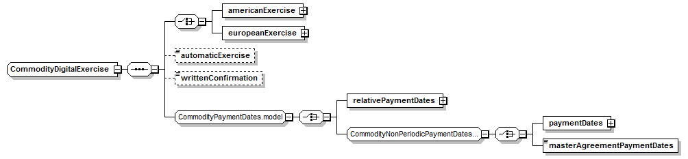 The parameters for defining how the commodity digital option can be exercised. I differs from the CommodityExercise type in that it lacks a specification of Settlement Currency. The Settlement Currency is specified in the 'featurePayment' element.