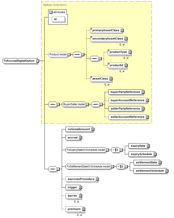 ( primaryAssetClass?, secondaryAssetClass*, productType*, productId*, assetClass*)?, buyerPartyReference, buyerAccountReference?, sellerPartyReference, sellerAccountReference?, notionalAmount, accrual, ( expiryDate | expirySchedule), ( settlementDate | settlementSchedule), exerciseProcedure?, trigger, barrier*, premium* |