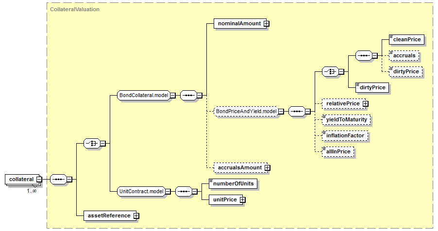 Collateral element is used to carry the quantity and price details that are required to ensure that a repo contract is executed at fair value, with the value of the collateral matching the cash amount of the repo. Collateral is declared as optional here, with multiple cardinalities, since there can be a repo "Multi", with multiple instruments specified, or a "Cash Borrow/Loan" and “TriPartyRepo” with no collateral. In general cases, however it should be specified. This element can be omitted in farLeg.